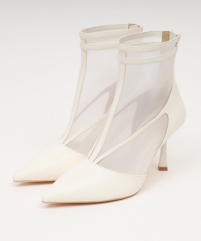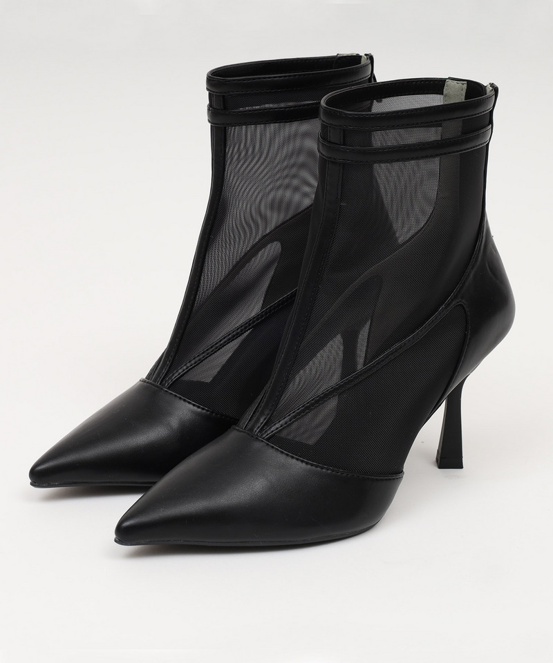 女性らしい透け感を演出するシアー素材に、脚を綺麗に魅せてくれるアクセントのラインデザインが映えるショートブーツ。