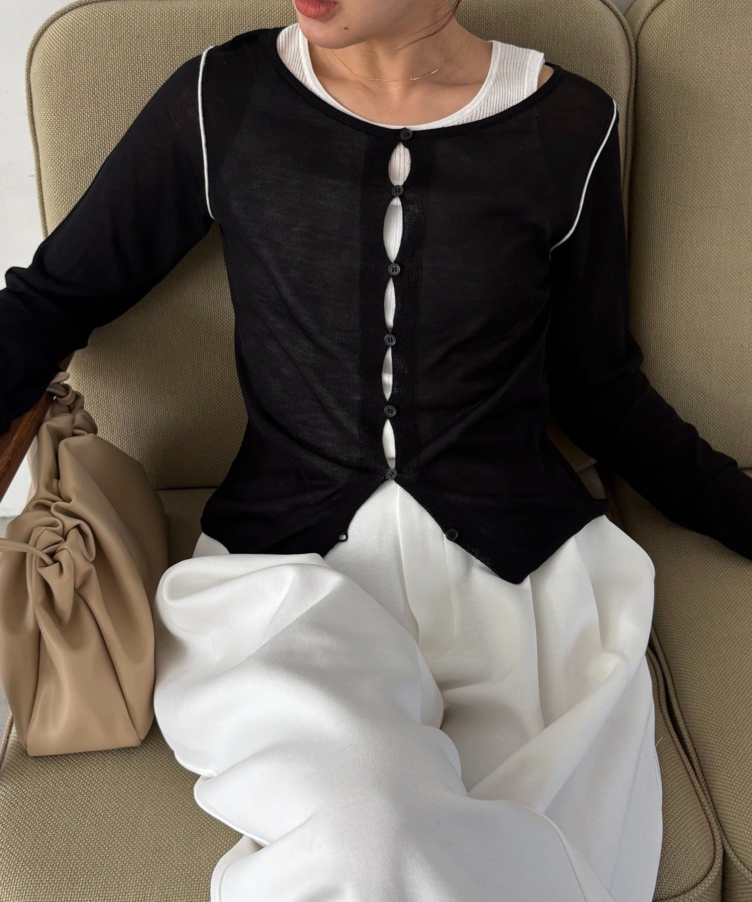 フロントのボタンがドロップ状に開き、中のタンクトップがチラッと見えるのがポイントです!