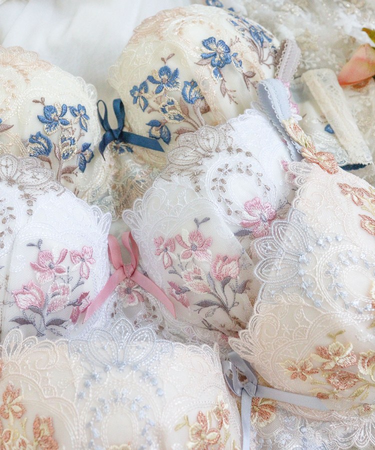 大人気を博した「アリーシャ」が、新しいカラーを加えてリバイバル。イングリッシュローズが咲きほこる、歴史あるヨーロッパのお城をイメージしたシリーズです。建物の優美な装飾を表現したレースは、繊細な幾何学模様の曲線を全体にあしらい、女性らしくも印象的なデザインに。配色は交互にすることで、思わず目をひく華やかさを演出します。カップにはお庭に咲くイングリッシュローズを散りばめ、きらめくラメ糸で豪華に仕上げました。その周りにはメインのお花を引き立てる手描き風のラフなステッチで、お花や曲線のモチーフをほどこして奥行き感をプラス。ストラップにはお揃いのアップリケをあしらいました。気品高いエレガントなイメージを身にまとうような、特別感あふれるコレクションです。