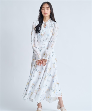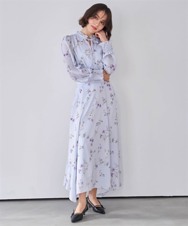 襟と袖口にあしらったフリルが、華やかな表情を添える花柄シアーブラウス。