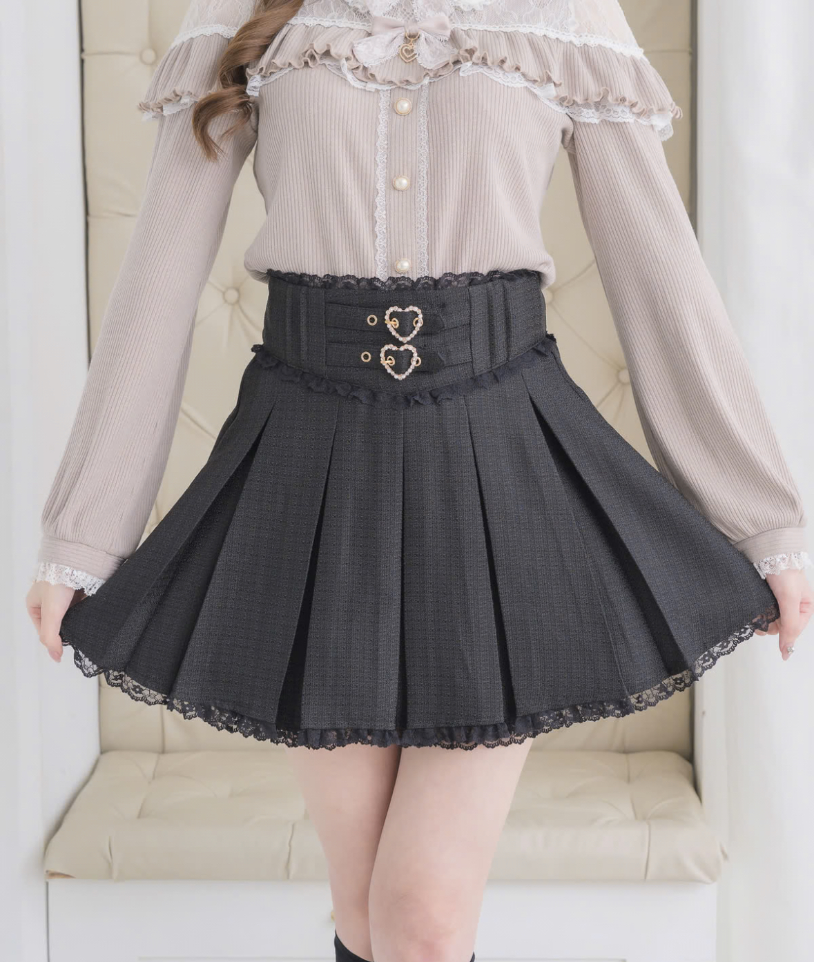 ウエストはV切り替えで、すっきりとしたラインに。フロントのハートバックルベルトが、ほどよいスパイスをプラスします。ツイード素材できちんと感を出しつつ、プリーツデザインでスクールライクなムードも演出。甘さときちんと感をバランスよく取り入れた、コーデの主役になる一枚です。