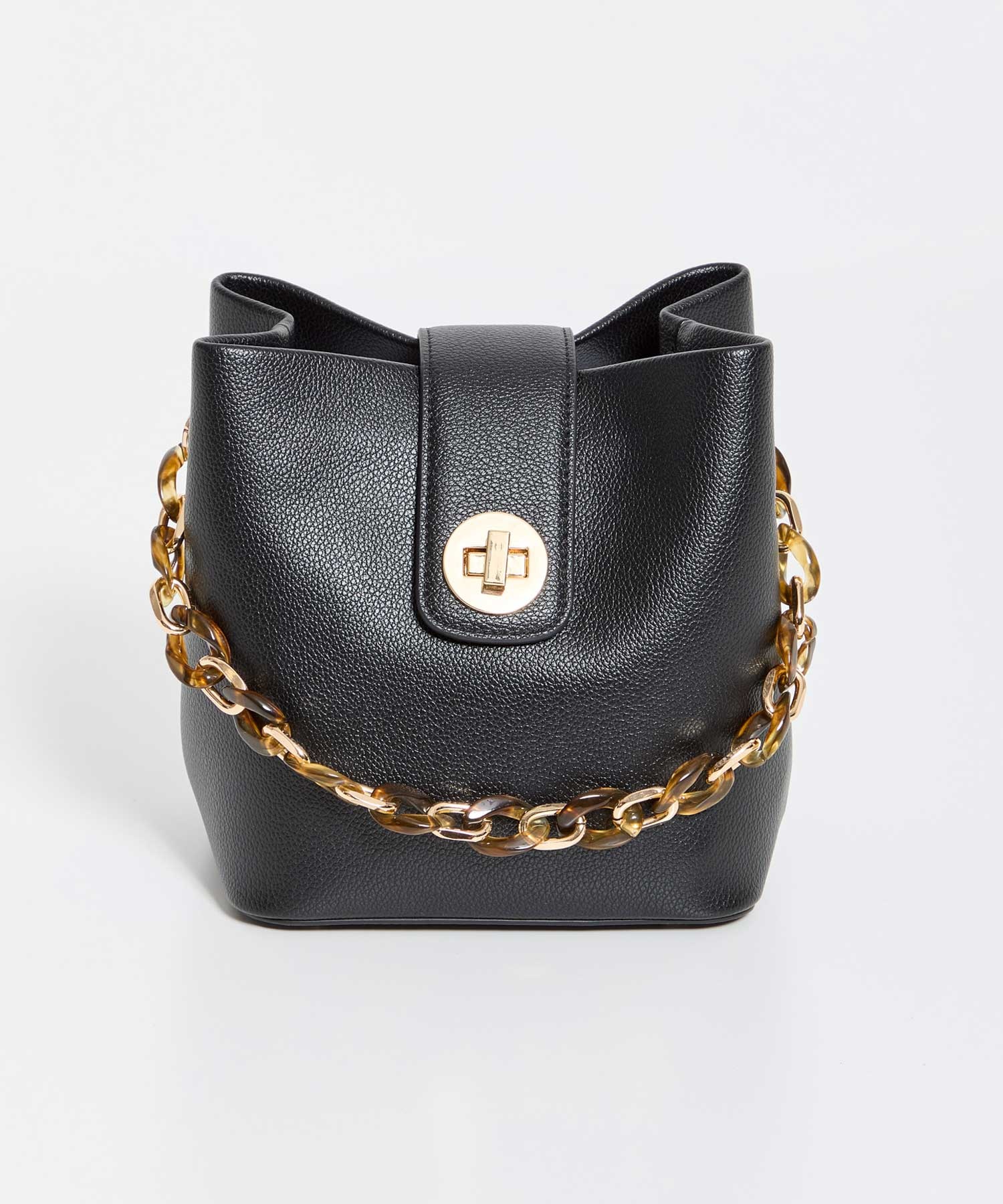 小ぶりで愛らしいバケツフォルムのデザインバッグ。