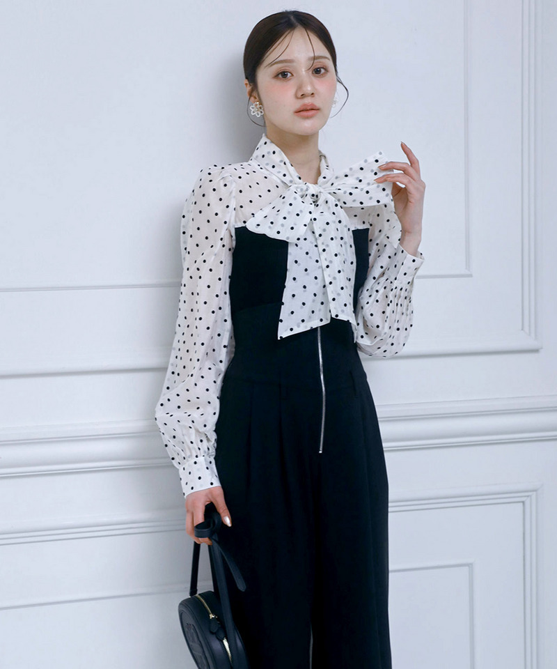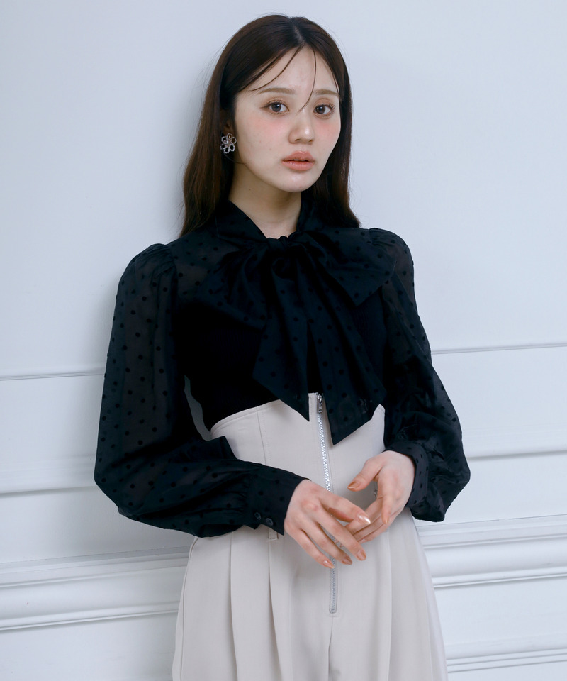 存在感抜群のフロッキードットブラウス×リブニットを組み合わせたドッキングトップス。