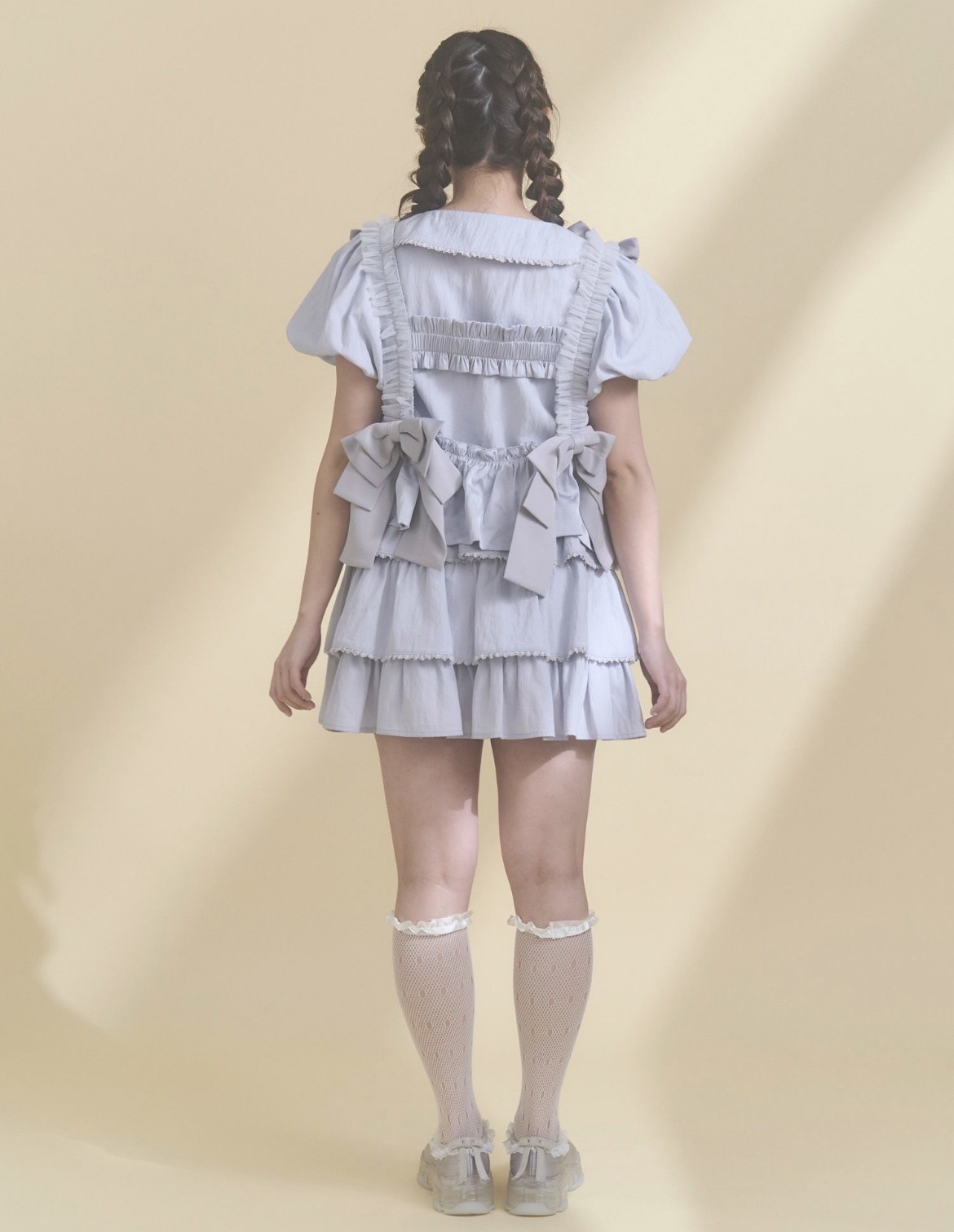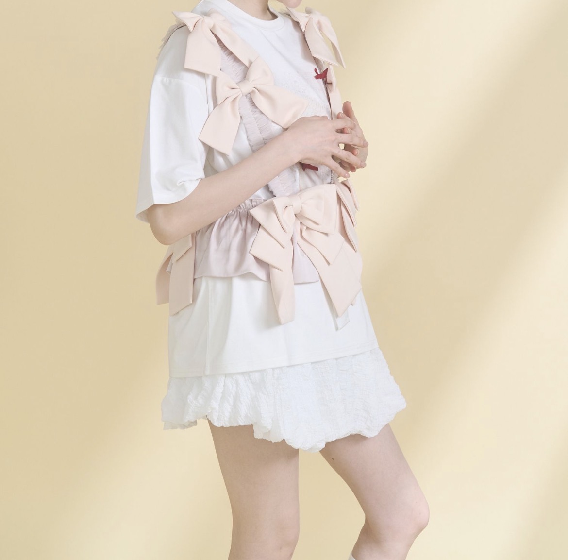 Tシャツやブラウス、ワンピースの上から重ねるだけで、甘さとアクセントをプラス。
