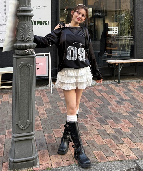 光沢感のあるサテン素材に、フロントのナンバリング刺繍と数字の中のレースで、甘さとストリート感を両立。