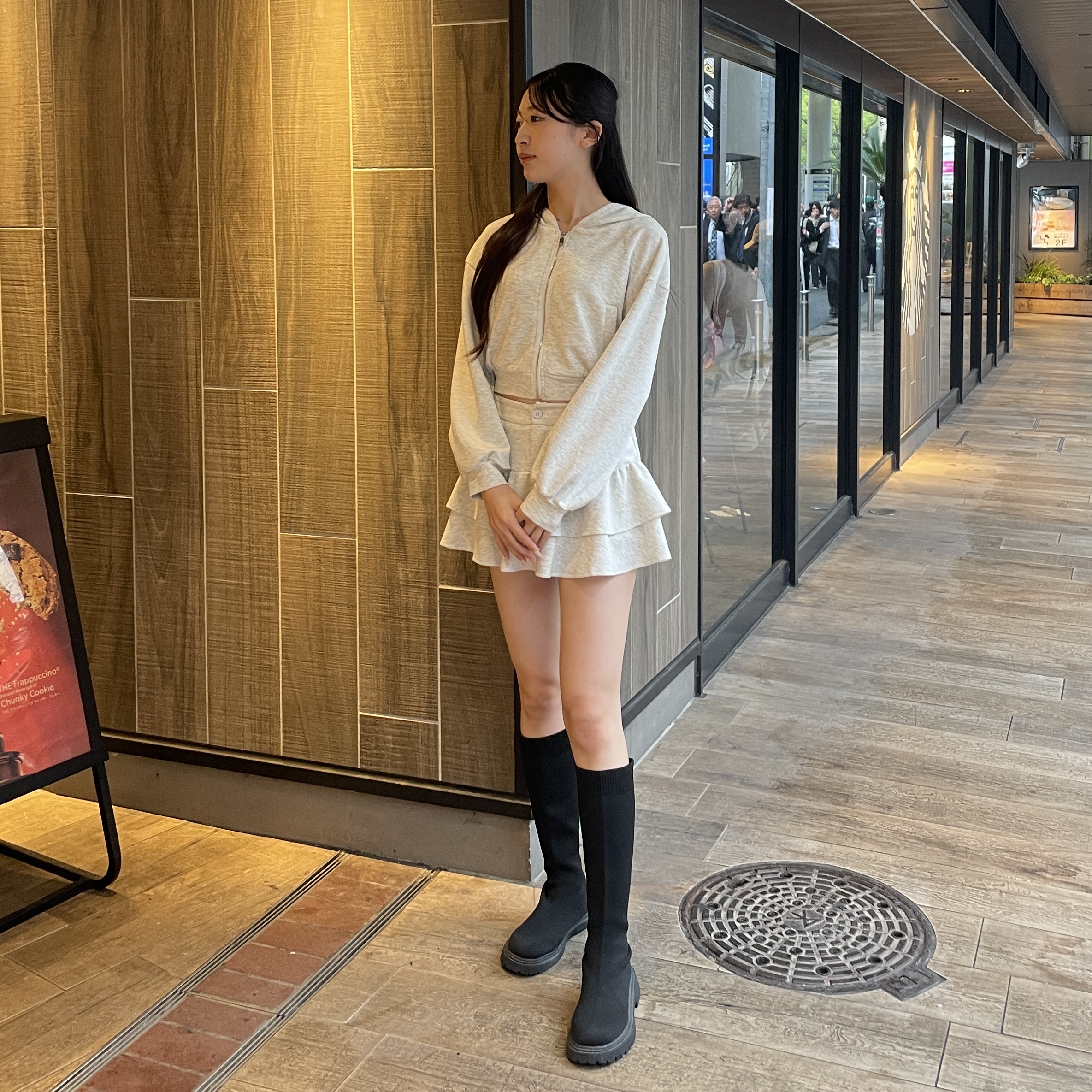 コンパクトなサイズ感のパーカーとフリルデザインのスカートで、ラフすぎず程よくガーリーな印象に💞