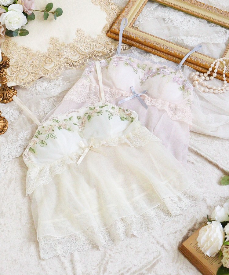「精神の美」という花言葉を持つクレマチスをモチーフにした、華やかで洗練されたシリーズです。クレマチスの花びらには1枚ずつ繊細なグラデーションをほどこして、上品で優雅な女性らしさを演出。花びらとは対照的なステッチで描かれたリーフは、素朴な可愛らしさをプラスしてくれます。幾何学模様をほどこしたスカラップは、あえて控えめなディテールでクラシカルな印象を後押し。バスト部分はあえて平行にカッティングすることで、いつもとは少し違うアウターライクなスタイルに仕上がりました。身生地にはシアーチュールとギャザーレースをあしらい、ふわりと広がるフレアシルエットが完成。バックスタイルにはポイントでお花のアップリケをプラスしています。繊細なラメ糸のきらめきが動くたびに上品な輝きを放つ、特別感あふれるコレクションです。