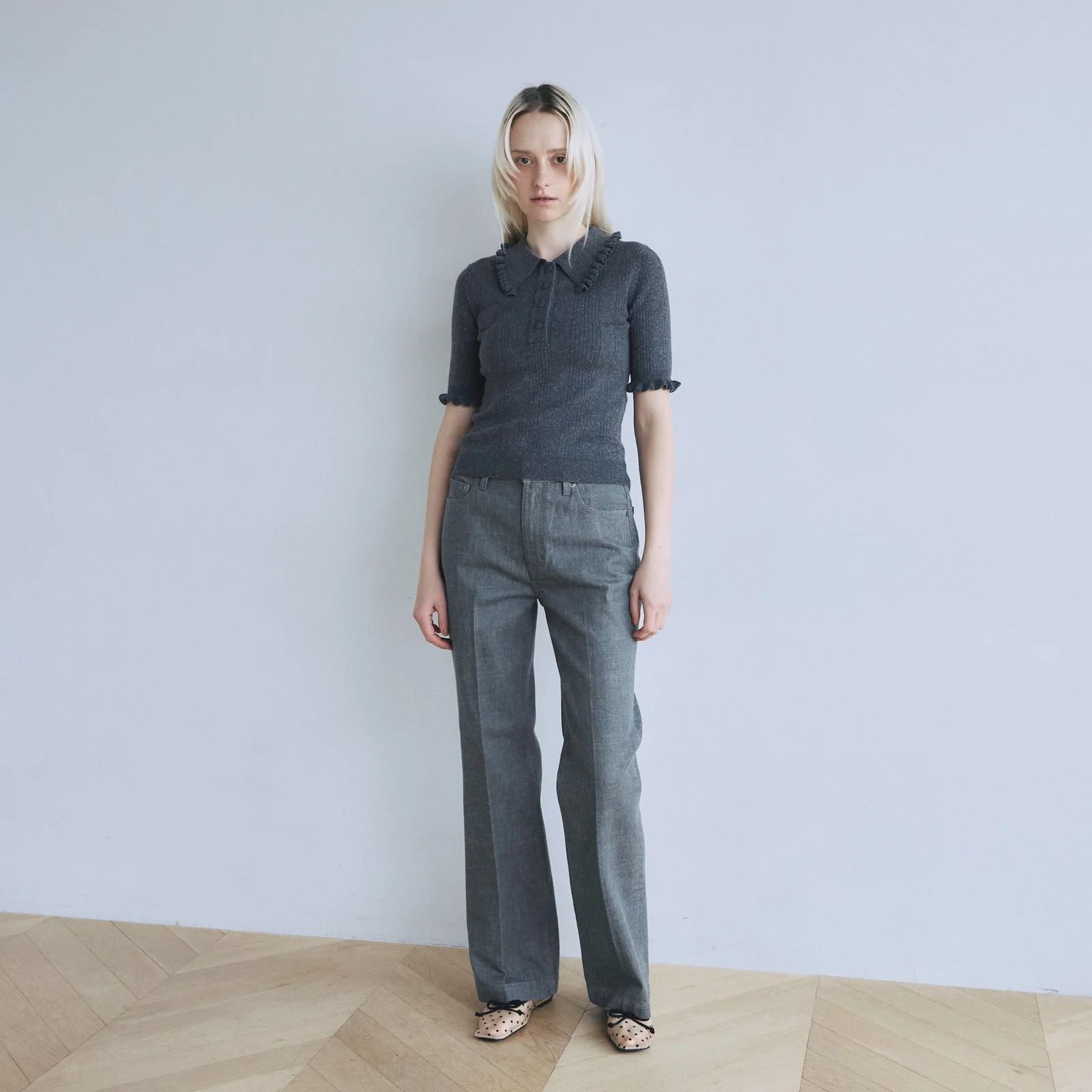 フリルや大きめのくるみボタンといった甘めのディテールを、ドライな質感のリブ素材でヘルシーな表情に仕上げました。