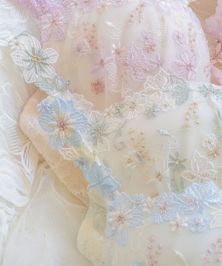 優雅なアンティークの壁紙を思わせる、繊細で上品なシリーズです。淡い色彩で彩られたお花の中にきらめくラメ糸を散りばめて、印象的な輝きを演出しました。ストラップにはお揃いのアップリケをほどこして、スカラップから繋がる1つのお花のリースのような、華やかなデザインに。リボン中央にもポイントでお花のアップリケを重ねて、思わず心ときめく特別感をプラスします。アンダー部分にはギャザーを寄せたレースをあしらうことで、ふんわりと優しい印象に仕上がりました。フラワーガーデンを訪れたような、お花にそっと包み込まれる可憐なコレクションです。