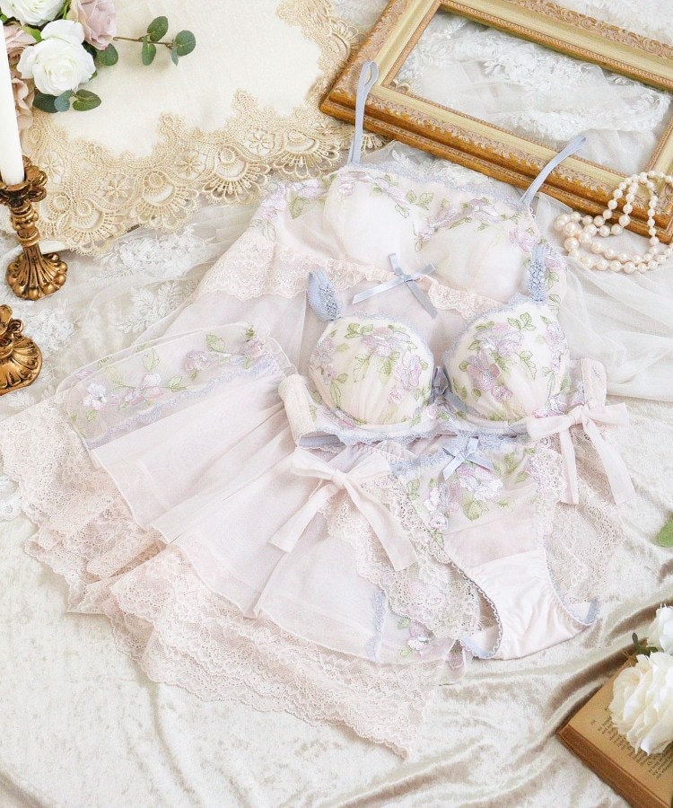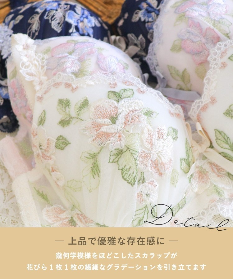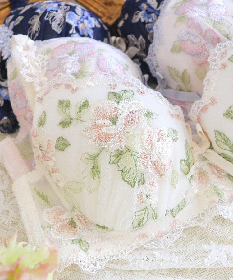 「精神の美」という花言葉を持つクレマチスをモチーフにした、華やかで洗練されたシリーズです。クレマチスの花びらには1枚ずつ繊細なグラデーションをほどこして、上品で優雅な女性らしさを演出。花びらとは対照的なステッチで描かれたリーフは、素朴な可愛らしさをプラスしてくれます。幾何学模様をほどこしたスカラップは、あえて控えめなディテールでクラシカルな印象を後押し。ストラップにはお花のアップリケをあしらいました。繊細なラメ糸のきらめきが動くたびに上品な輝きを放つ、特別感あふれるコレクションです。