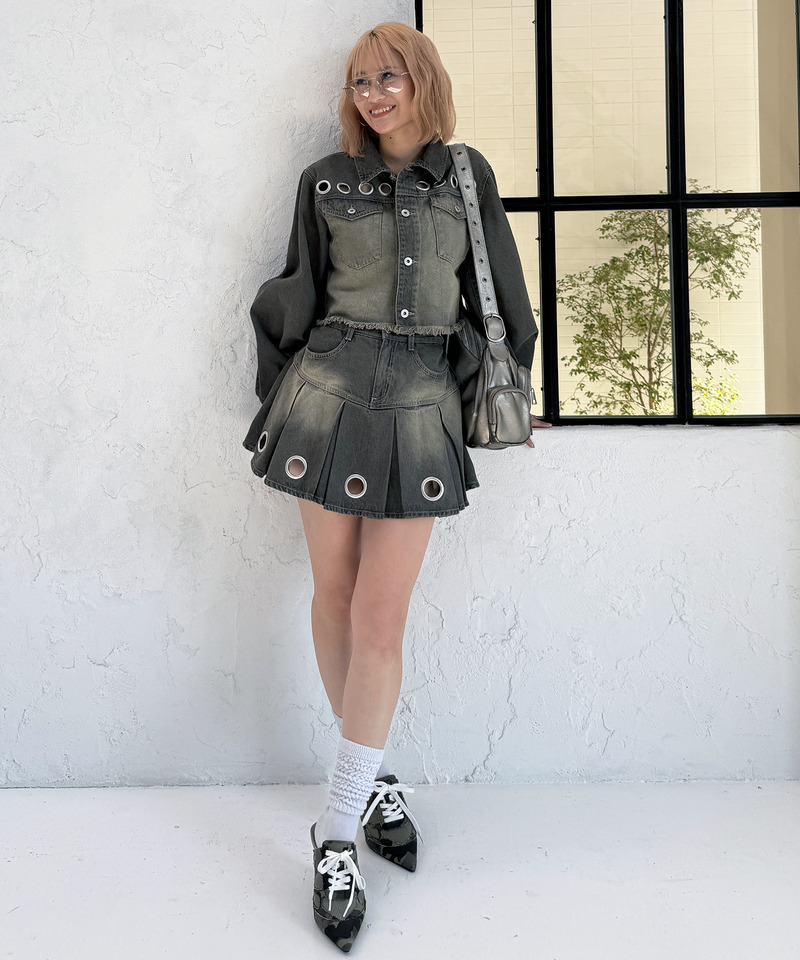 揺れるプリーツが脚をすっきり見せ、裾のハトメがさりげないストリートアクセントに。