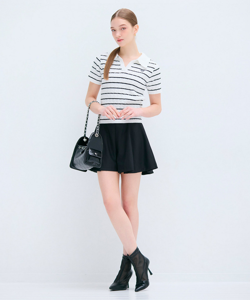 コンパクトなトップスやニットを合わせるとバランスの良い大人フェミニンなスタイリングが完成します。