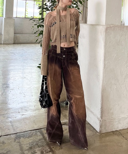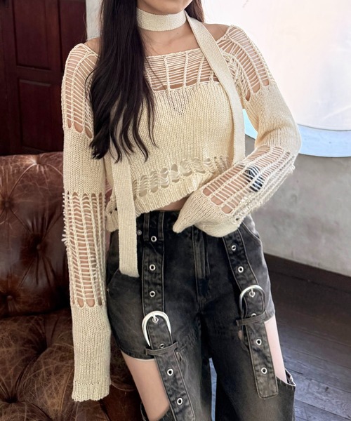 肌がのぞく度に甘な編み地がアクセントのショート丈ニット。