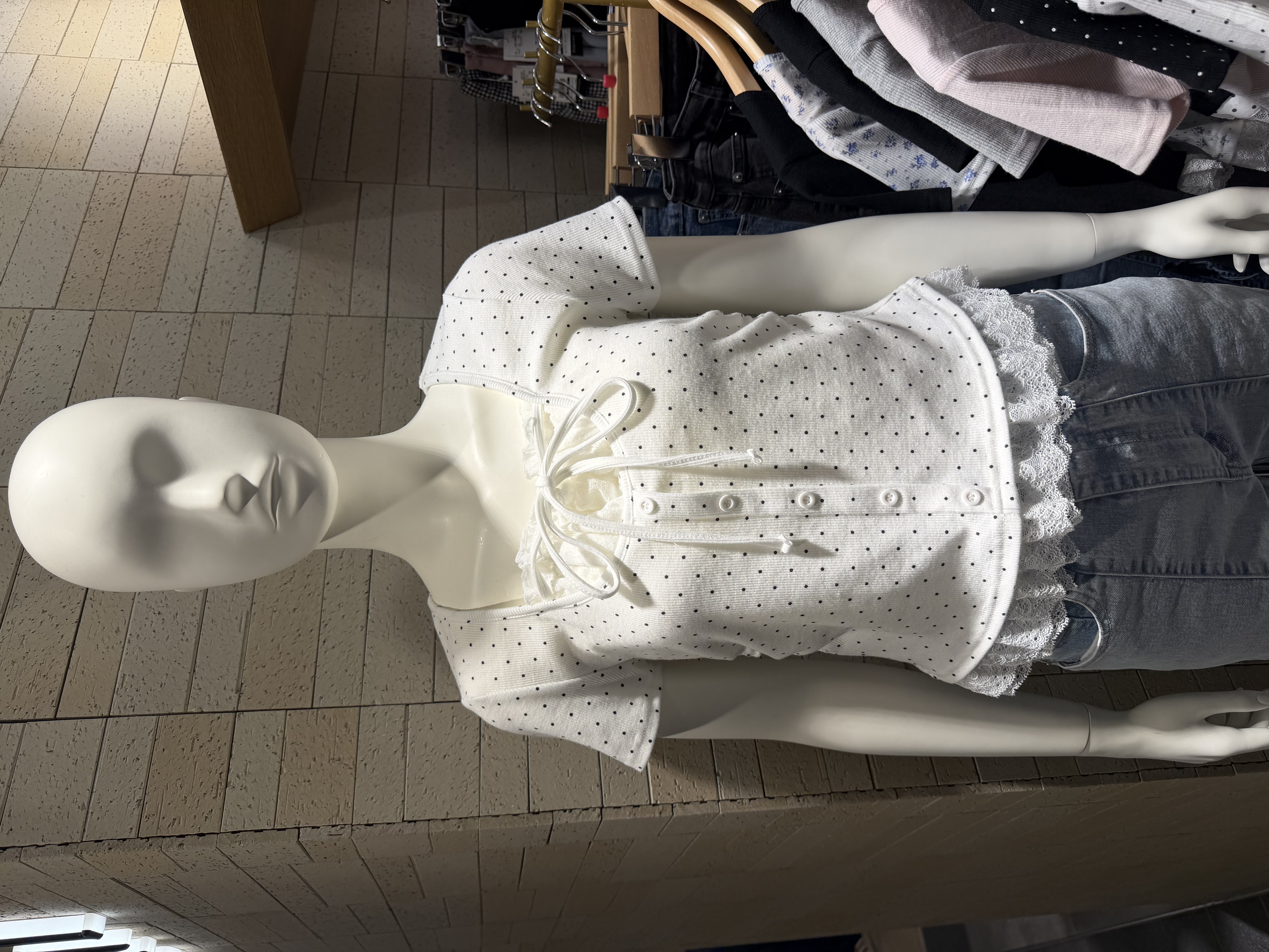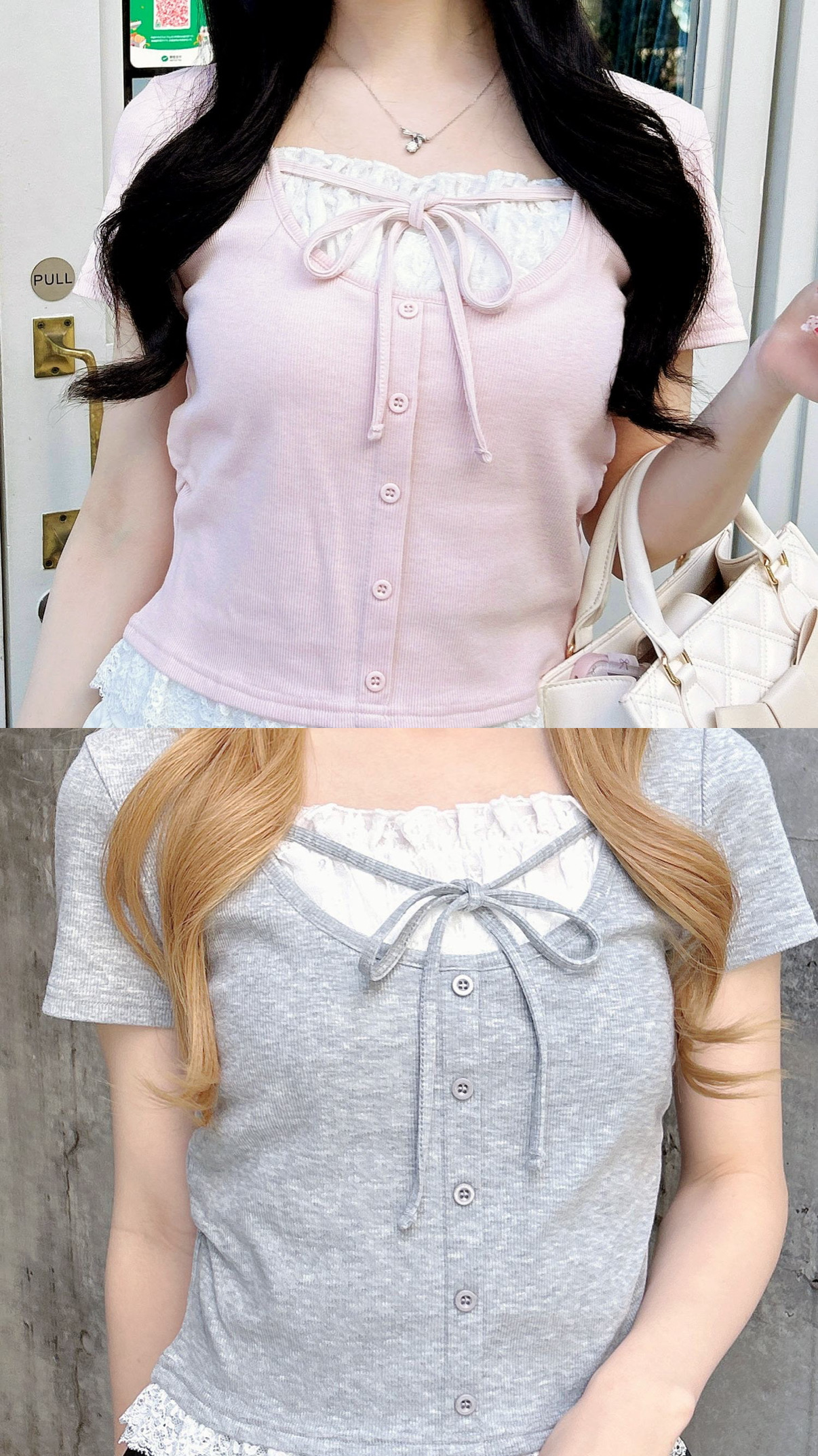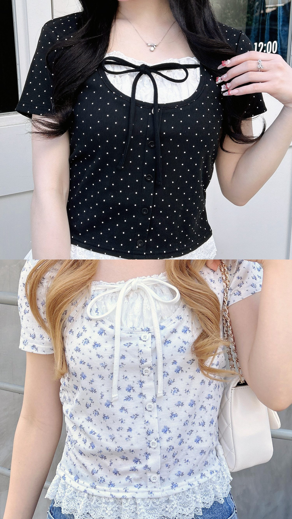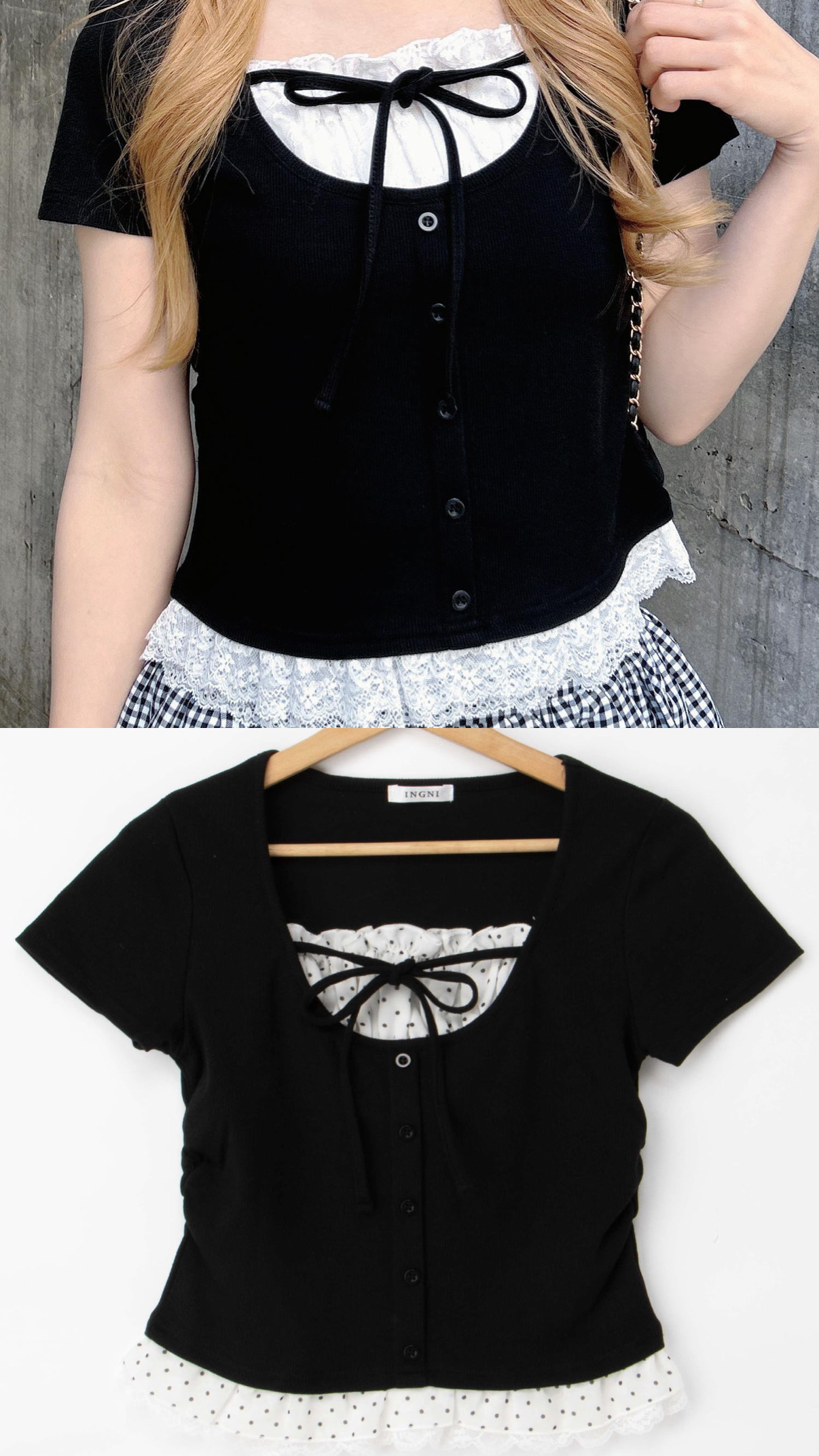 大人気のレイヤード風トップスが半袖になって登場しました★ 胸元と裾にあるレースが今年のトレンドになっています.*・゚ カラー展開はオフクロドット/オフドット/ハナ/ピンク/グレー/クロ/黒ドットの7色展開です☆ お友達とお揃いや今度のライブや現場の参戦服にいかがですか♡ ●1261-100245 レースレイヤード風リボン付リブトップス ¥2,970 tax in