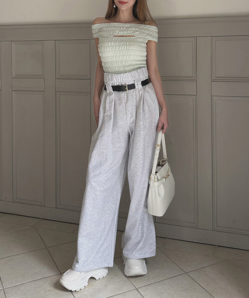女性らしさを引き立てる華やかなオフショルダートップス。