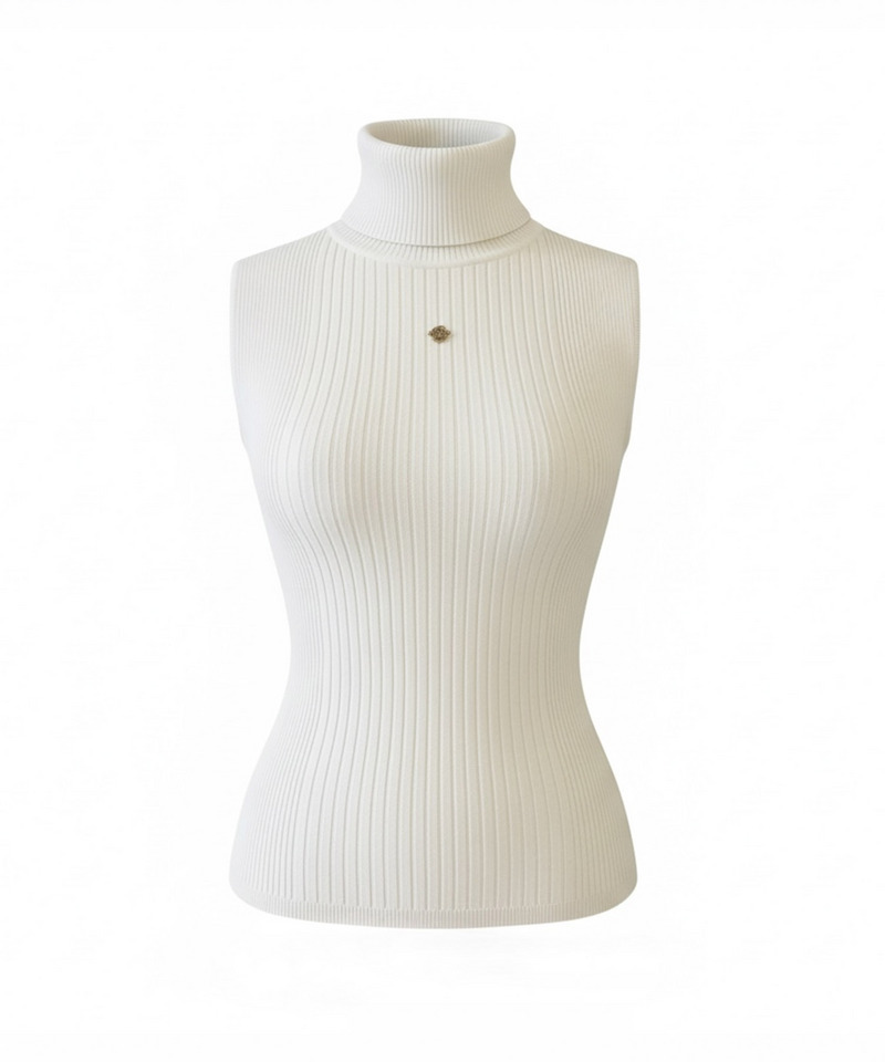 胸元のバラ型プレートが目を惹く、ノースリーブのタートルネックニット。