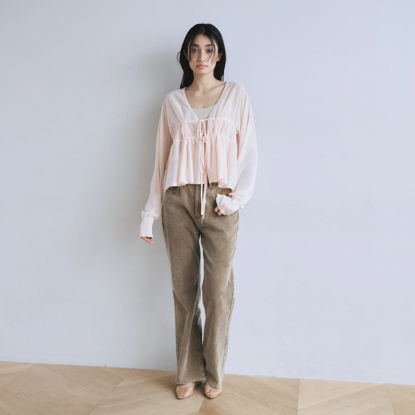空気を含んだようなエアリーなシアー素材にフロントのシャーリングとリボンで遊び心を添えた主役級カーディガン。
