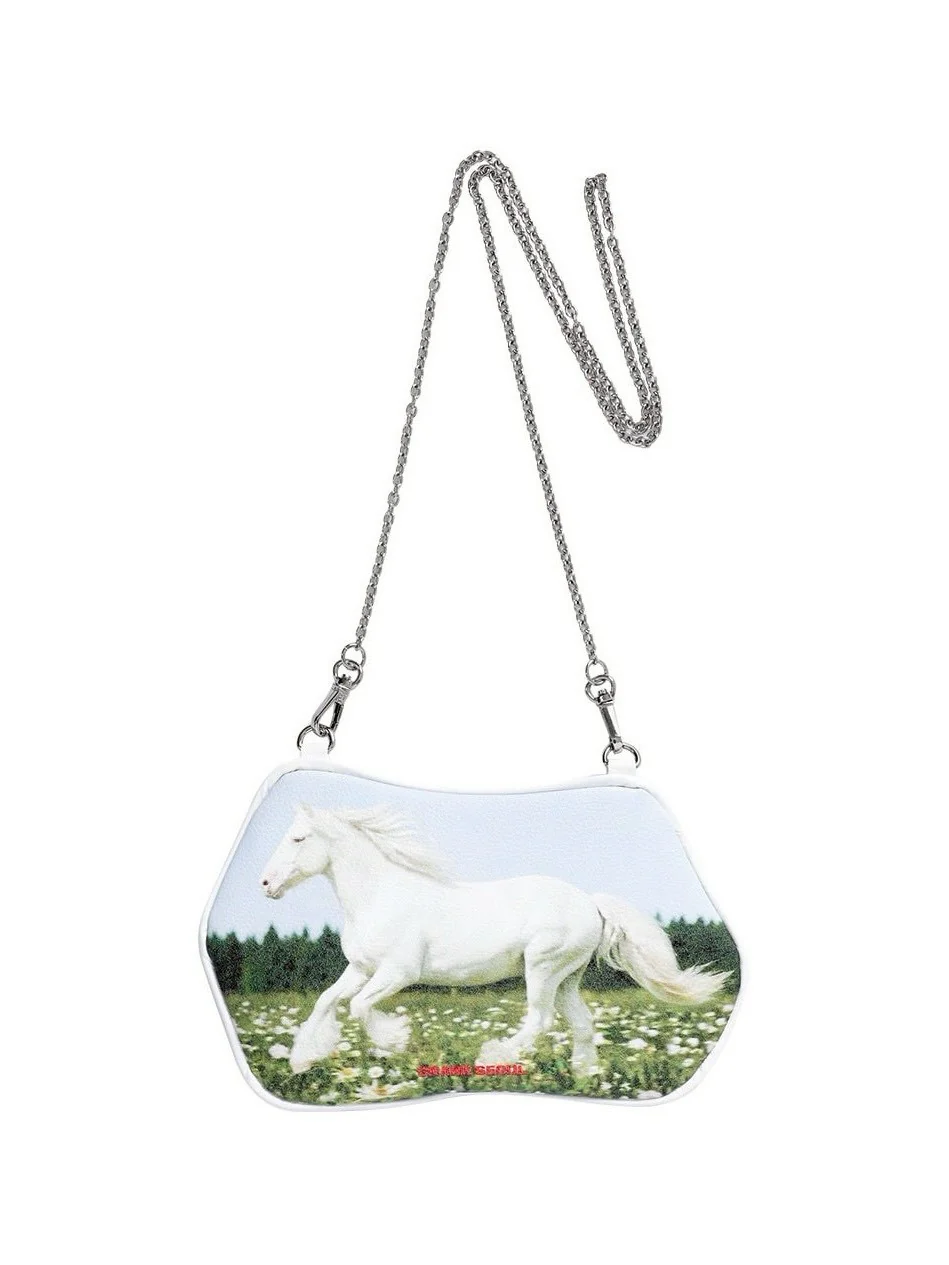 草原を駆ける白馬のグラフィックが目を惹く、コーデの主役になるミニチェーンバッグです。独特なフォルムとシルバーチェーンがエッジを効かせ、シンプルな着こなしにプラスするだけで遊び心のある洗練されたスタイルに仕上げてくれます。