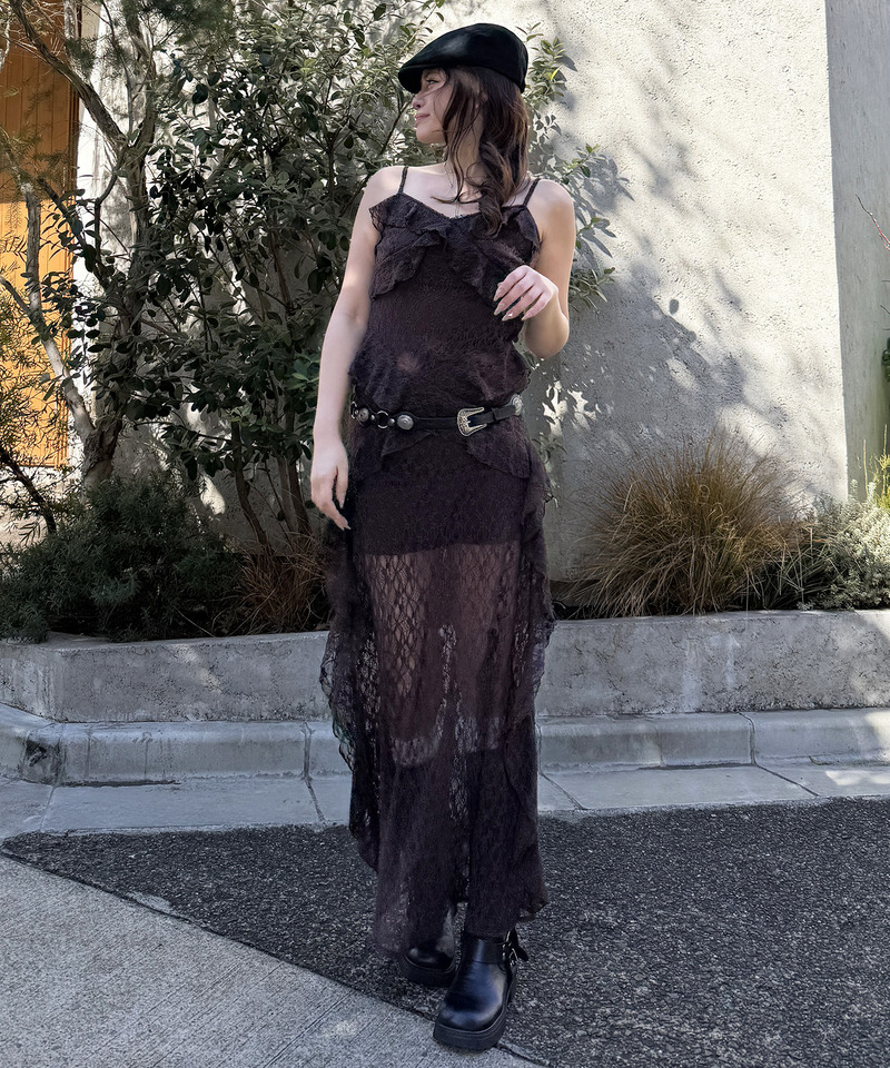 大胆なスリットとフリルデザインを施したキャミワンピース。