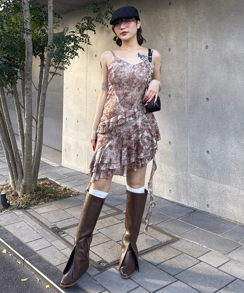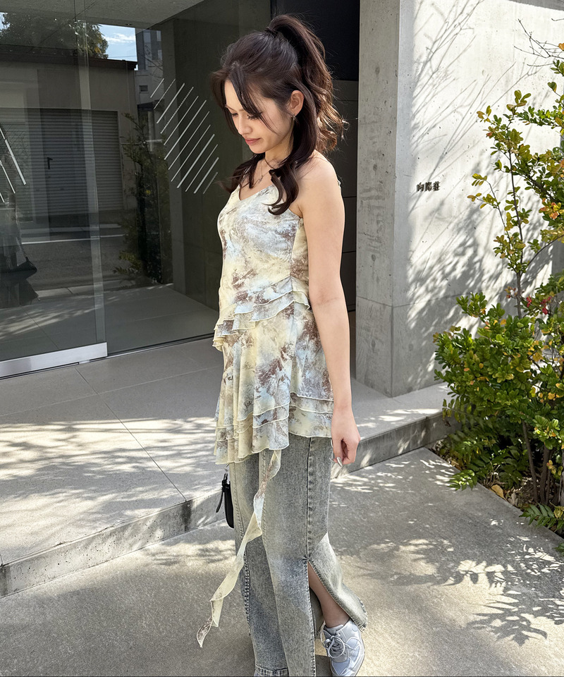 斜めに入ったティアードデザインとイレギュラーヘムで、揺れ感たっぷり、動きに合わせて表情が変わる1枚です。