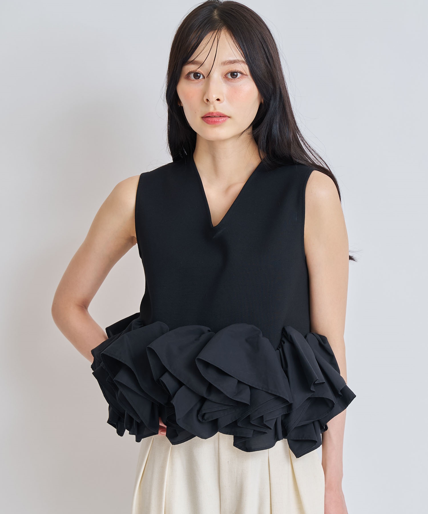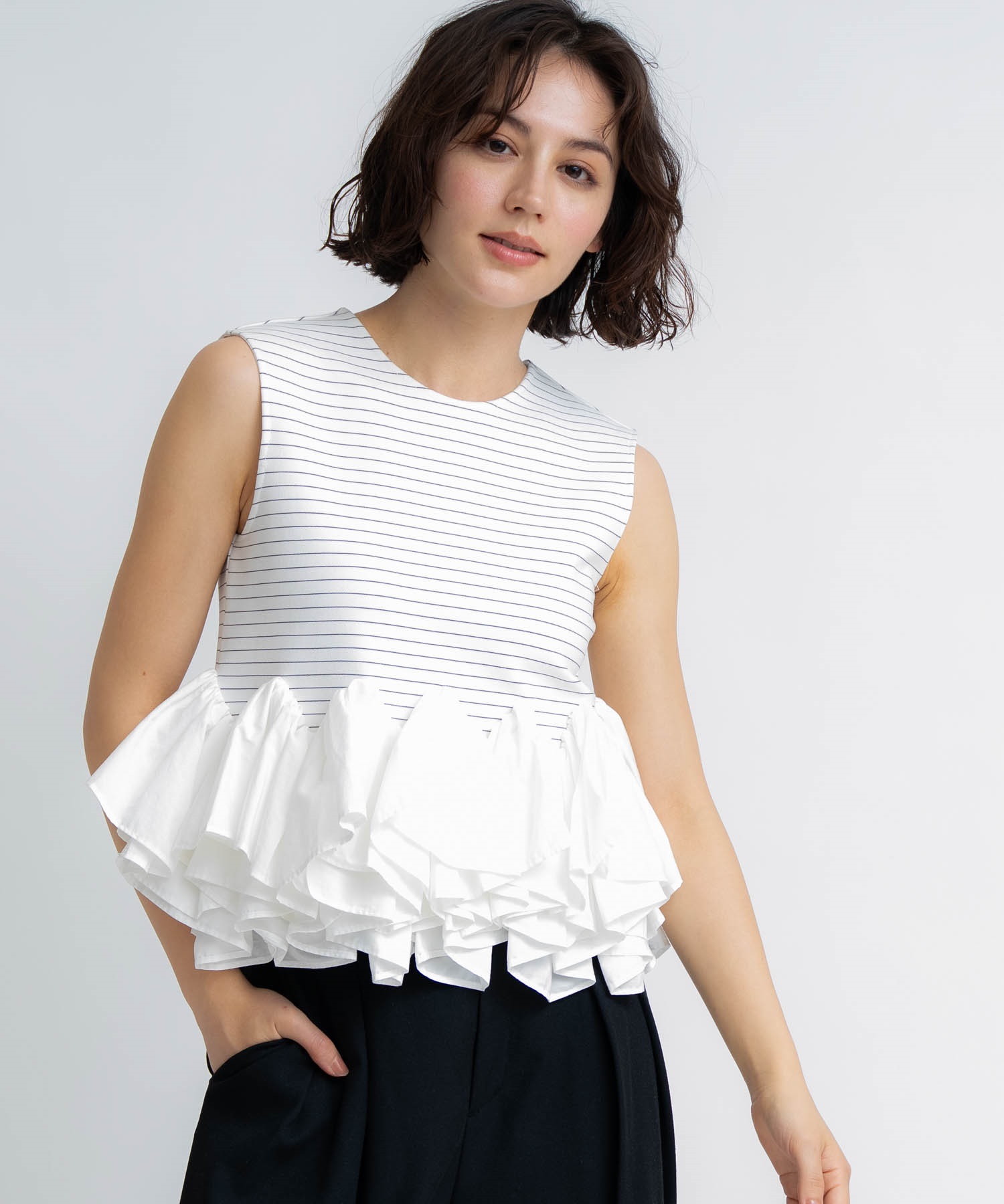 ペプラム部分は張り感のあるローン生地で立体感のあるシルエットを演出し、さりげない華やかさをプラス。